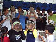 | 大きな缶を筒状にして、丈夫なビニールシートを輪ゴムで止めただけの箱メガネです。とっても簡単につくれますが、なかなかどうして、ちゃんと海の中は見えるんです。 小雨模様だったので、少し狭いですが、レストハウスの下で制作しました。 |